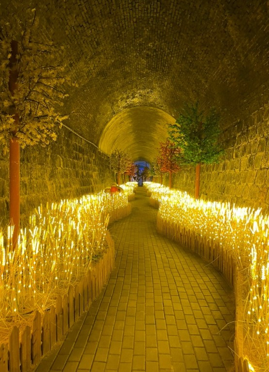 트윈터널은 다양한 빛의 조형물로 가득 차 있습니다. 특히 황금빛 조명이 인상적인 황금 보리밭 구간과, 천장에 매달린 다채로운 우산들이 독특한 분위기를 자아냅니다. 이곳은 사진 찍기에도 최적의 장소입니다.