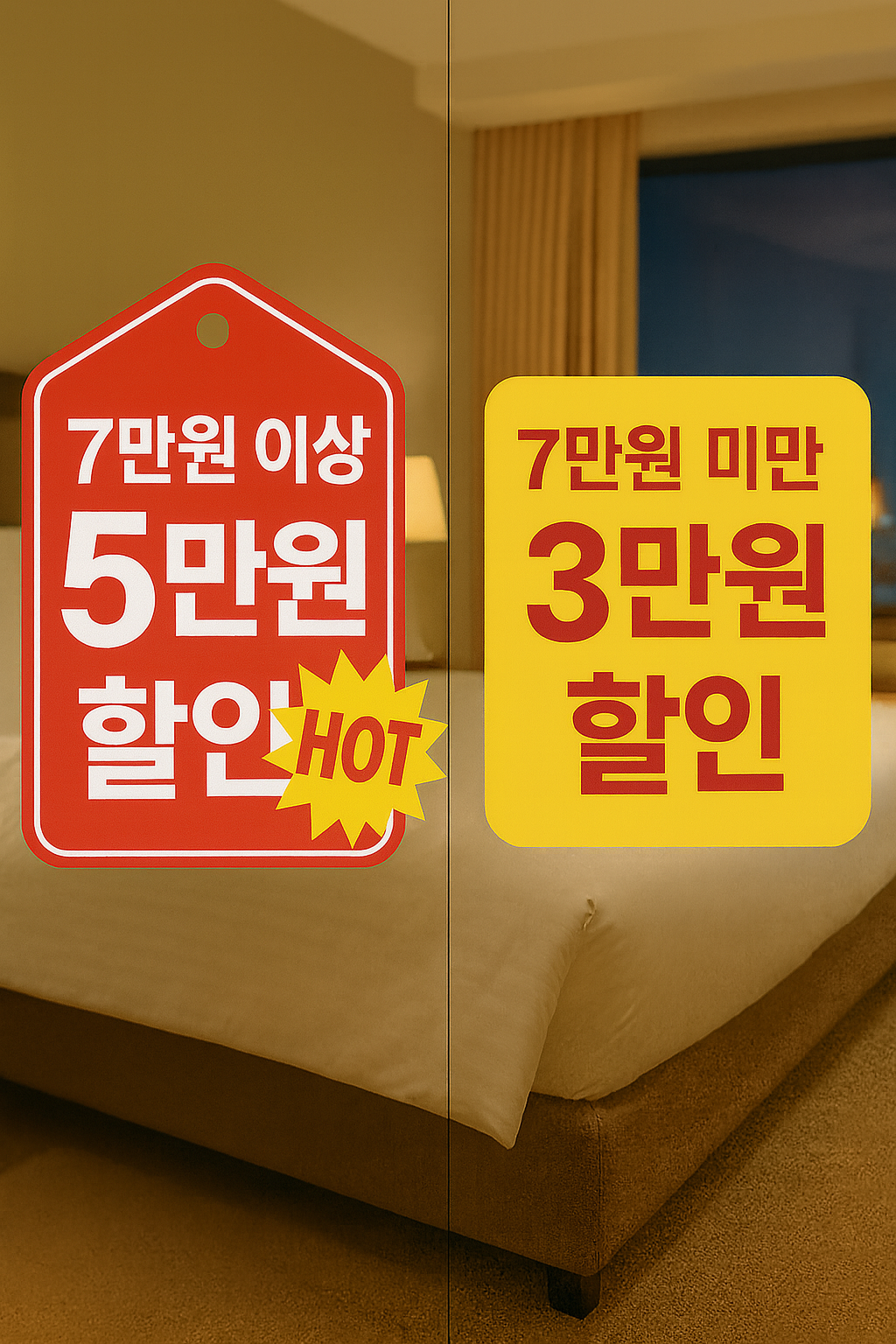 | 겨울편 | 11월 3일(월) ~ 12월 7일(일) | 11월 3일(월) ~ 12월 7일(일) | 7만원 이상 숙박 시 3만원 할인7만원 미만 숙박 시 2만원 할인 |